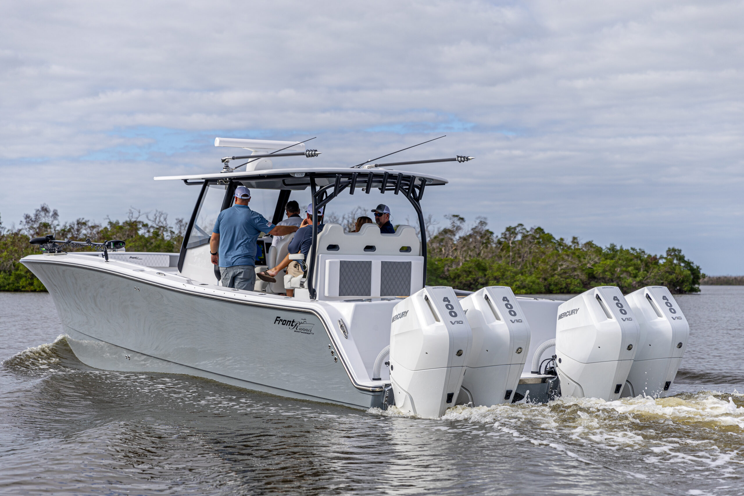 The 47′ Front Runner delivers luxury and offshore performance with quad Mercury V10 400s, premium electronics, Seakeeper stabilization, and a spacious cabin with A/C, berth, and shower.