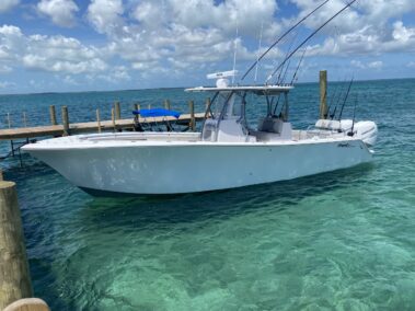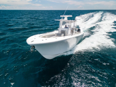 The 33 Center Console is crafted with the same attention to detail and smooth ride as the larger models in the lineup—just in a more versatile size. Designed with five macerated in-deck fish boxes, a comfortable transom seat, dual helm chairs, and a spacious console with head, this boat blends functionality with comfort. Available with twin or triple engine configurations, the 33 CC delivers serious power and performance.