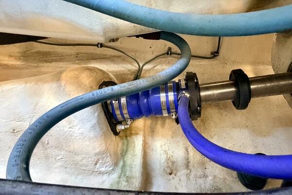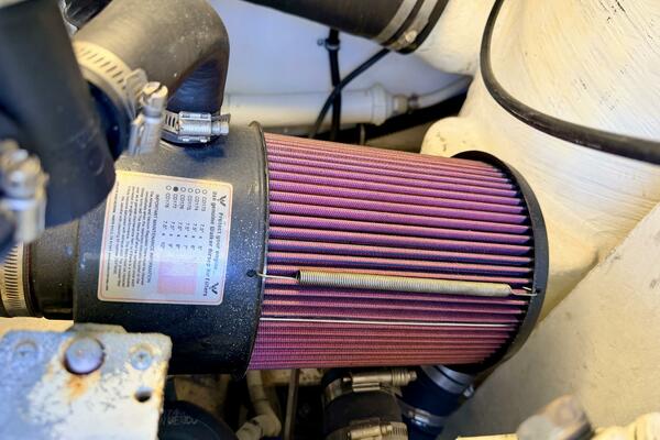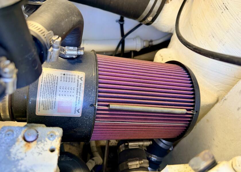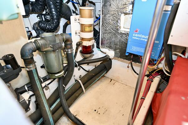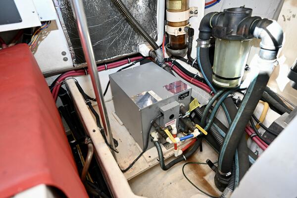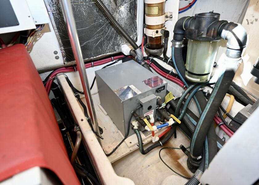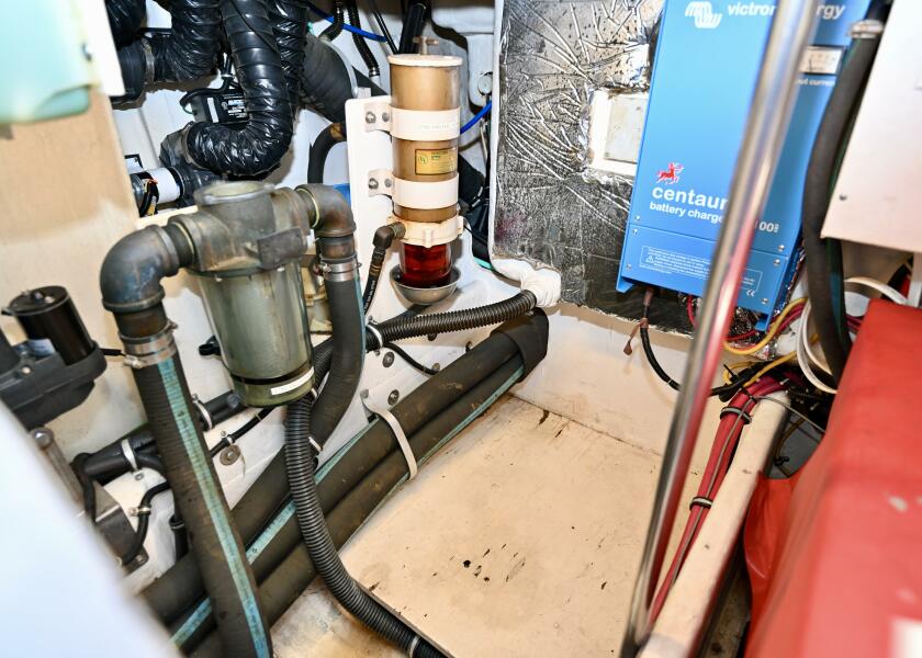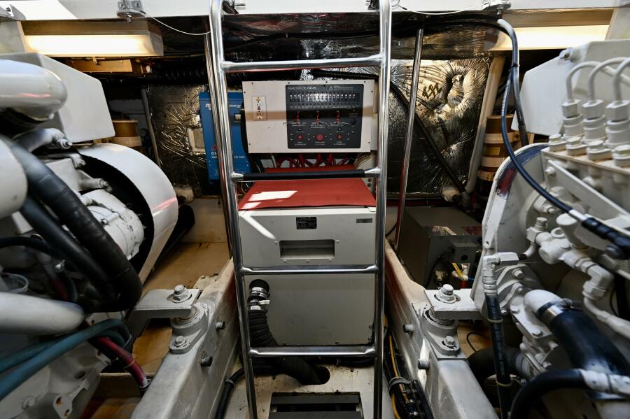 The engine compartment is impressively organized, cleanly finished, and sound-insulated to minimize noise and vibration throughout the cabin. Twin Cummins 6CTA 8.3-M Diamond Series 450hp diesel engines are mounted on heavy-duty stringers, offering reliable performance and efficient cruising. The Mase generator, replaced in 2021, is positioned for easy service access.