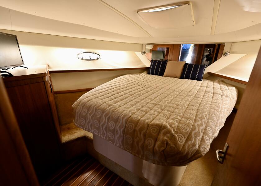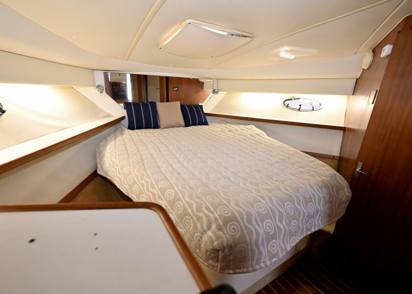 · In the Plan B layout, the forward cabin is configured with a pedestal queen berth (centered) rather than a standard forward V-berth. The result: a more comfortable “owner’s suite” feel.