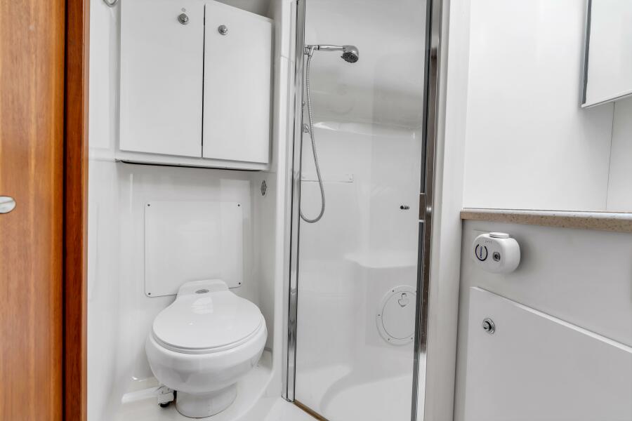 Enter the Cabin from centerline of the Helm Deck to find the full Galley to port. Just forward is the large convertible dinette. There is a roomy Bunk Room to starboard. The Master Stateroom is forward with starboard side Head access. The Head is also accessible to the Main Cabin.
