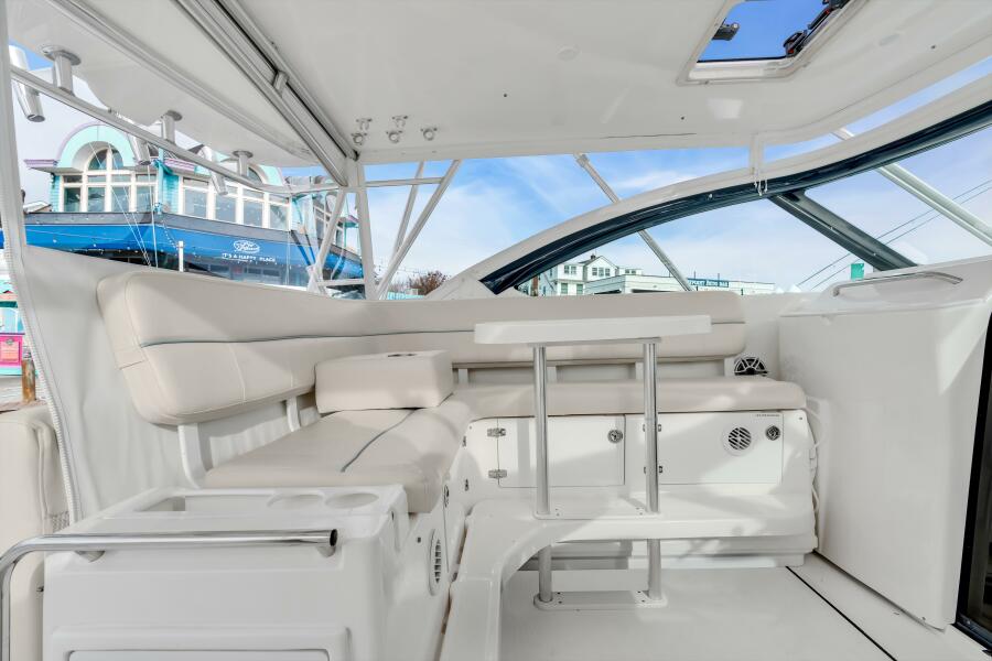 A top-selling model during her production years, the chief attribute of the Tiara 4200 Open is her ability to serve equally well as a high-end cruising yacht or serious sport fishing machine. Tiara has been building practical, dual-purpose Express yachts like this for years. No surprise, then, that the 4200 Open raised the bar for boats of her type when she was introduced in 2003. Built on a solid fiberglass hull with wide 14'11" beam and prop pockets to level the engines, generous bow flare and wide reverse chines provide an exceptionally dry open-water ride. This Plan B interior layout offers a roomy Bunk Room to starboard and a Master Stateroom forward. Tiara's satin-finished teak joinery and traditional teak and holly sole offer a pleasant contrast to the high-gloss interiors found in many Express yachts.